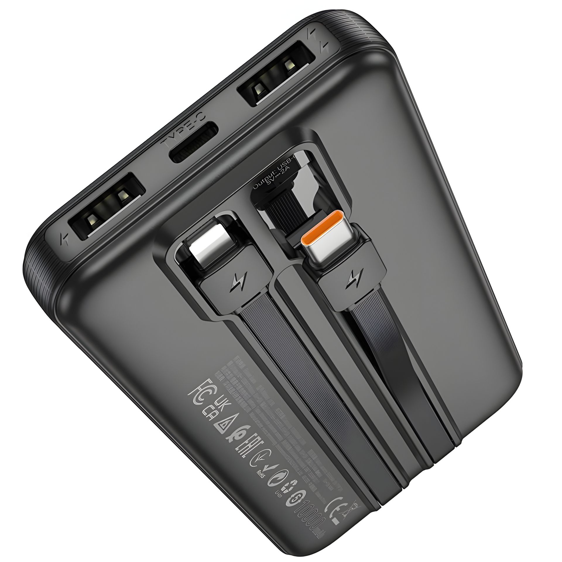 Power bank Hoco J118 10000mAh с кабелем 2-в-1 (Type-C/Lightning) black — это мощное и удобное устройство для зарядки ваших гаджетов. В комплекте идет встроенный кабель с разъемами Type-C и Lightning, что делает его универсальным для большинства современных устройств. Корпус из огнестойкого пластика ABS+PC обеспечивает надежность, а индикатор уровня заряда позволяет контролировать оставшуюся емкость аккумулятора.