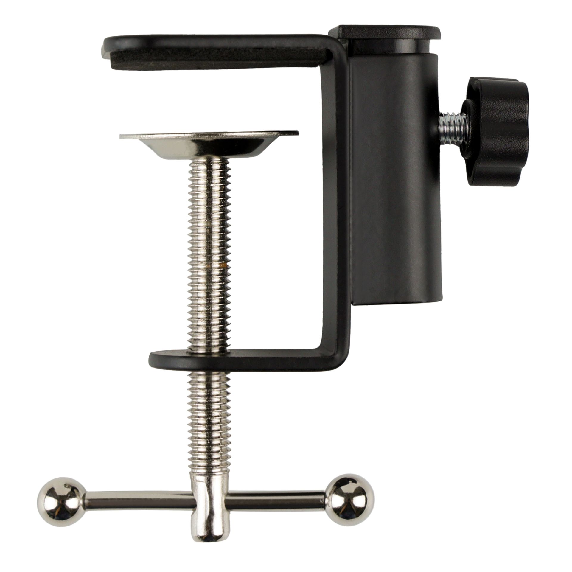 - Крепление выполнено в форме прочной струбцины, которая надёжно фиксируется на краю стола, полки или стойки толщиной до 5.5 см. Такой способ установки экономит место и обеспечивает устойчивость даже при активном использовании.