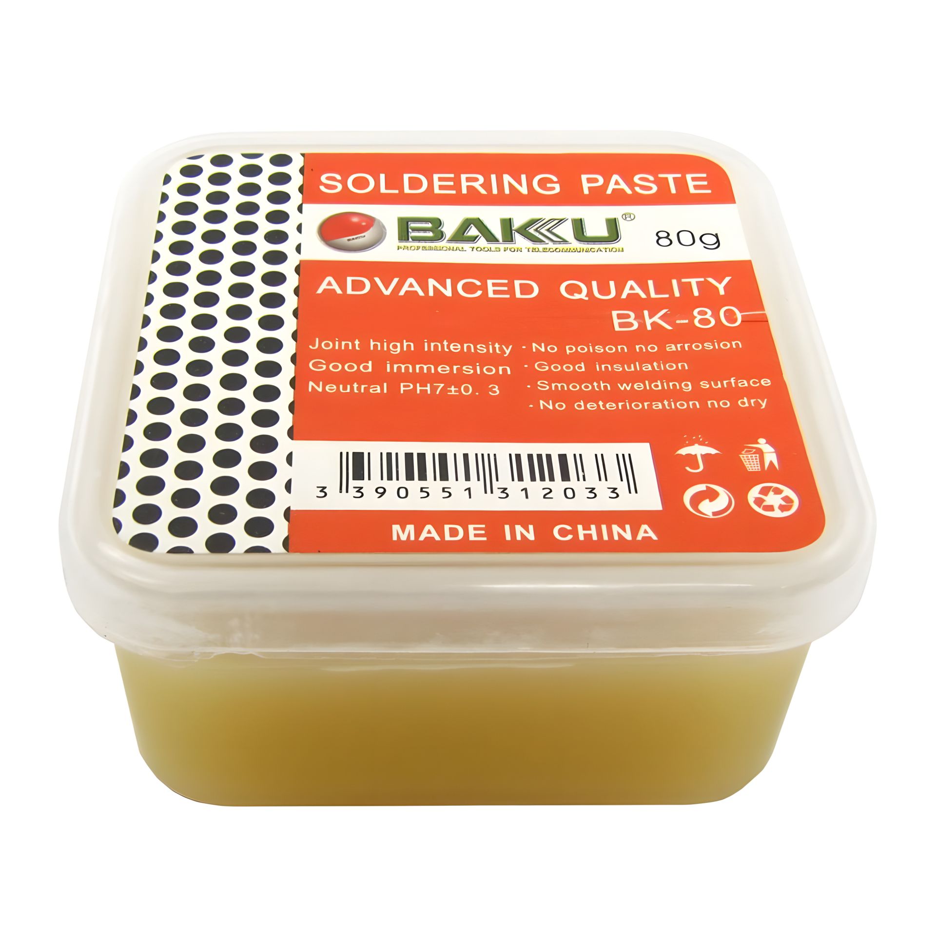 Флюс-паста BAKU BK-80 (80 г) – це високоякісний флюс на каніфольній основі, що не містить кислот, що робить його безпечним для паяння дрібних та чутливих електронних компонентів. Відрізняється чудовим змочуванням робочих поверхонь та високою термостійкістю, що гарантує стабільну якість з'єднань.