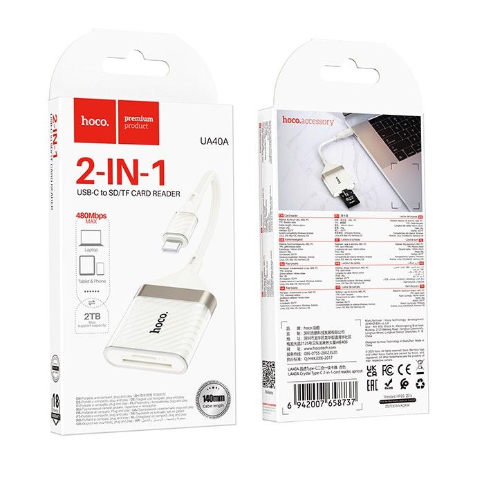 Hoco UA40A – це практичний та універсальний картридер, який забезпечує швидкий доступ до даних на SD та TF картах пам'яті. Пристрій дозволяє передавати, зчитувати та перезаписувати файли безпосередньо на комп'ютер або ноутбук через роз'єм Type-C без необхідності встановлення додаткових драйверів. Сумісність із широким спектром операційних систем, включаючи macOS та Windows, робить адаптер зручним рішенням для щоденної роботи з мультимедійними файлами та документами.
