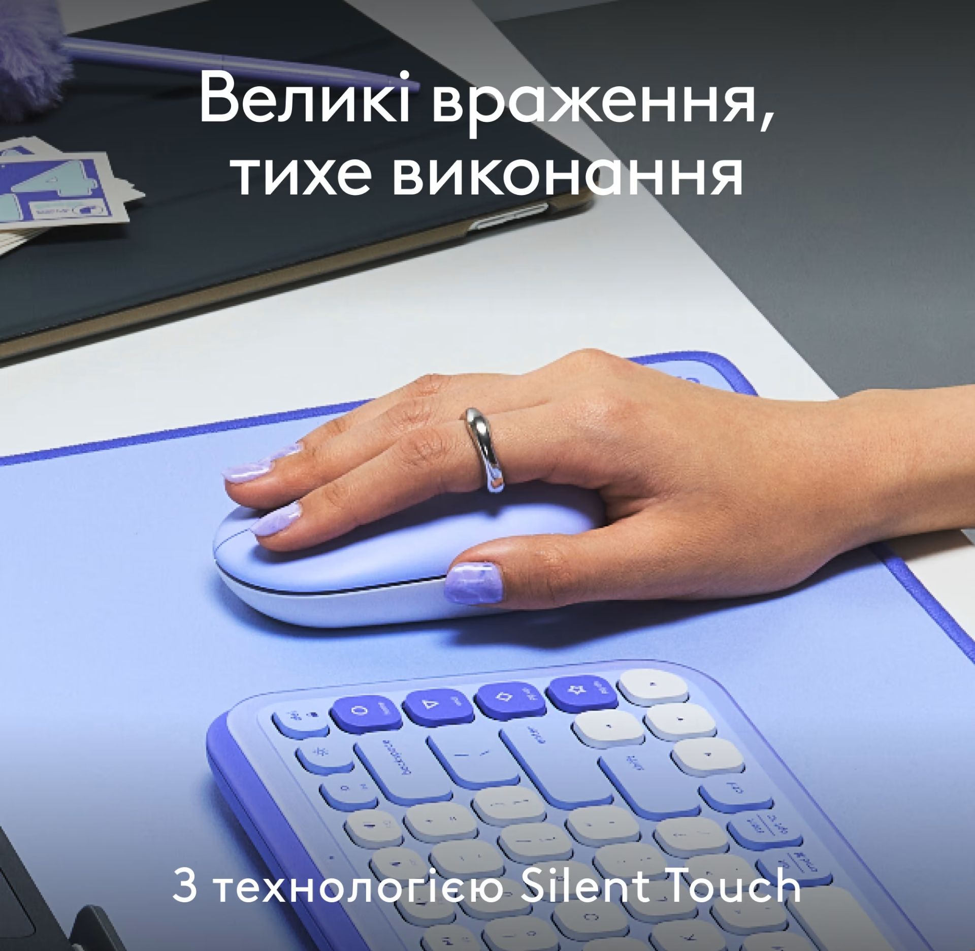 - Технологія Silent Touch знижує шум натискань до 90%, ідеально підходить для офісу, бібліотеки або нічного використання.