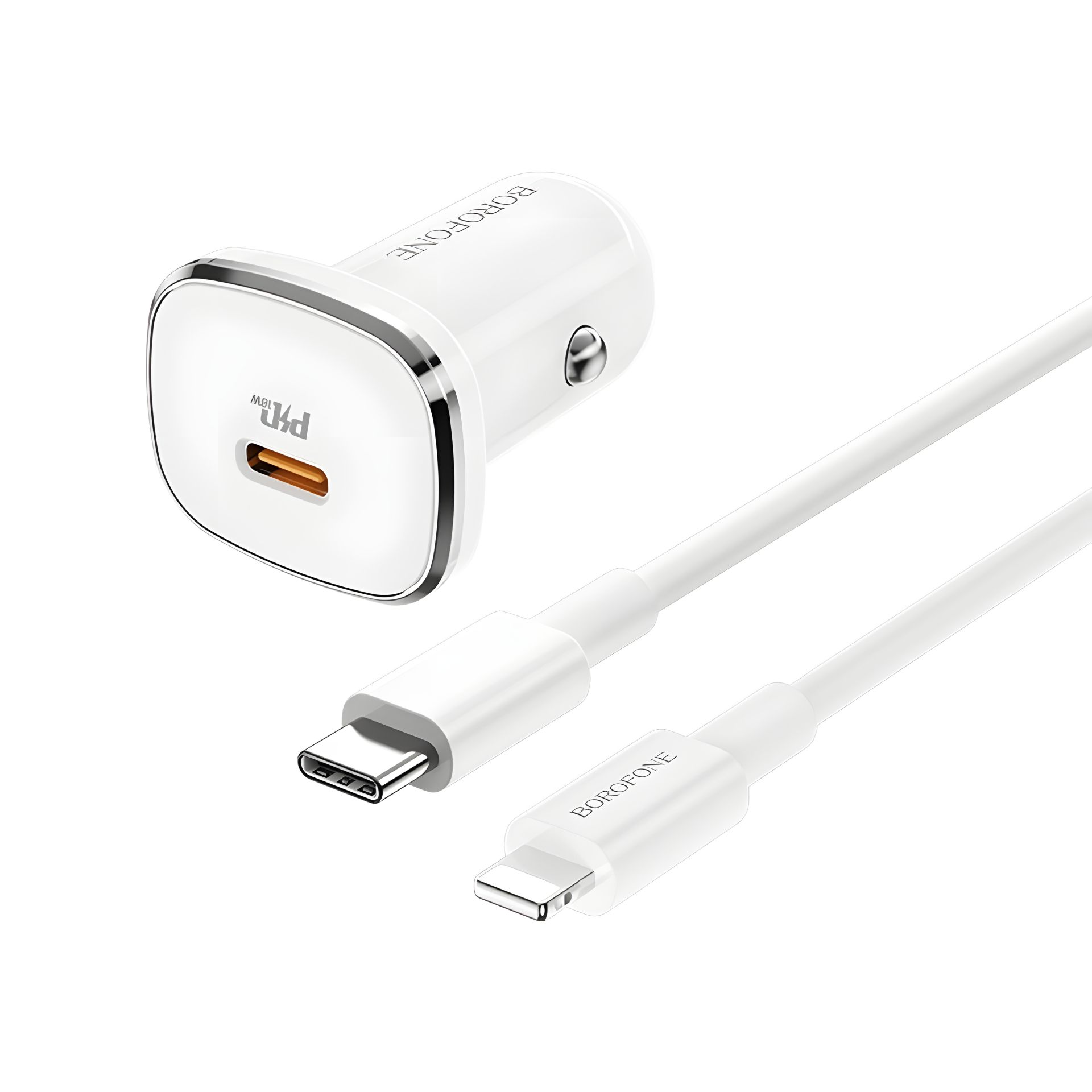 Автомобільний зарядний пристрій Borofone BZ12B, Type-C, PD, кабель Type-C to Lightning, білий