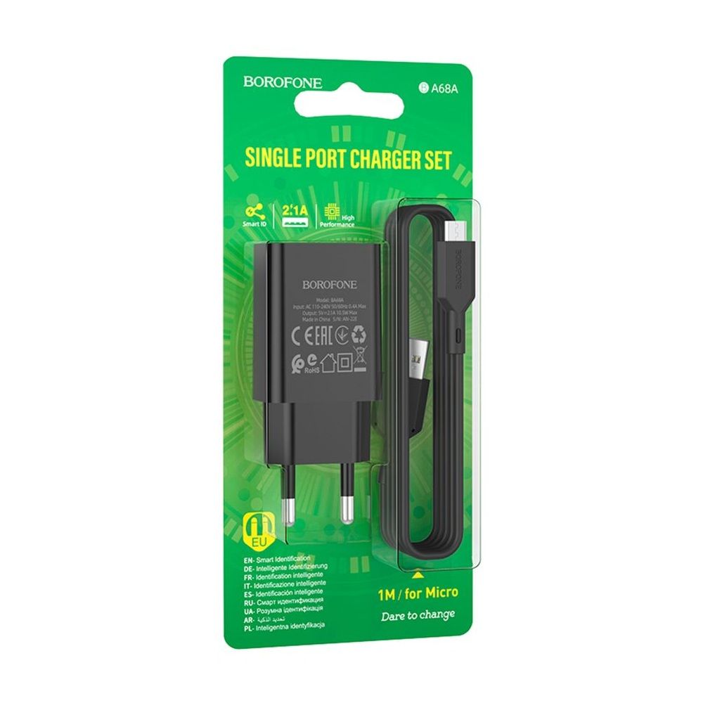 Мережевий зарядний пристрій Borofone BA68A, кабель USB to MicroUSB, 1USB, 2.1A, Чорний