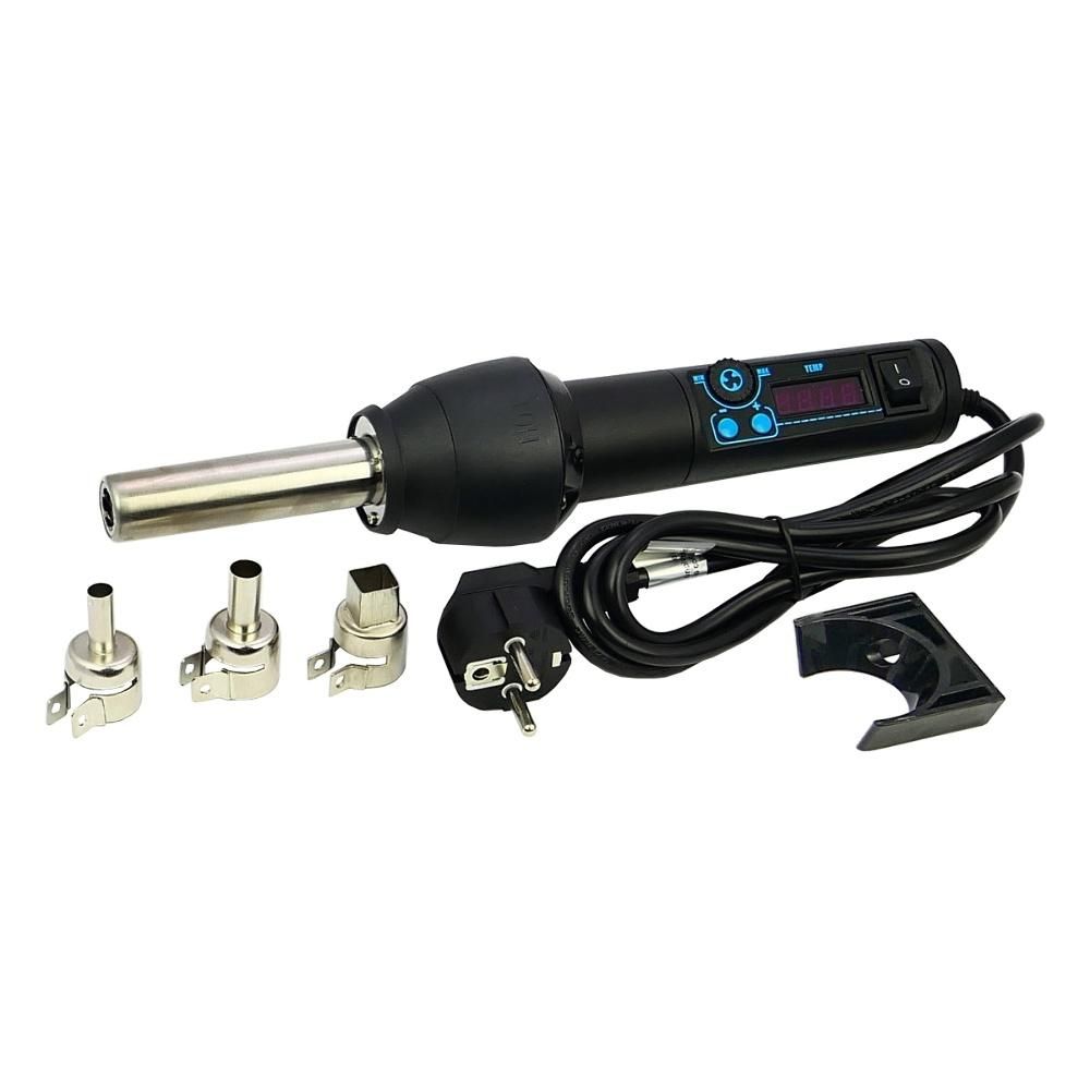 Цей інструмент забезпечує точне регулювання температури та повітряного потоку, що дозволяє працювати з різними матеріалами – від мікросхем та плат до пластикових деталей та корпусних елементів.