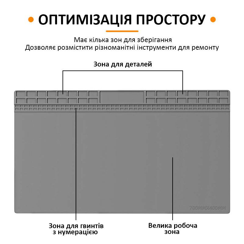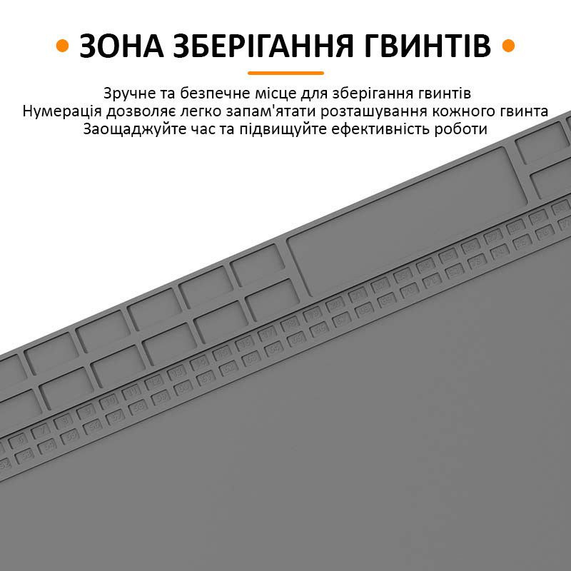 - Поверхня килимка оснащена вбудованими секціями, осередками та заглибленнями, які дозволяють акуратно розміщувати інструменти, гвинти, мікросхеми та інші дрібні компоненти. Це значно підвищує зручність та ефективність роботи, забезпечуючи порядок на робочому місці.
