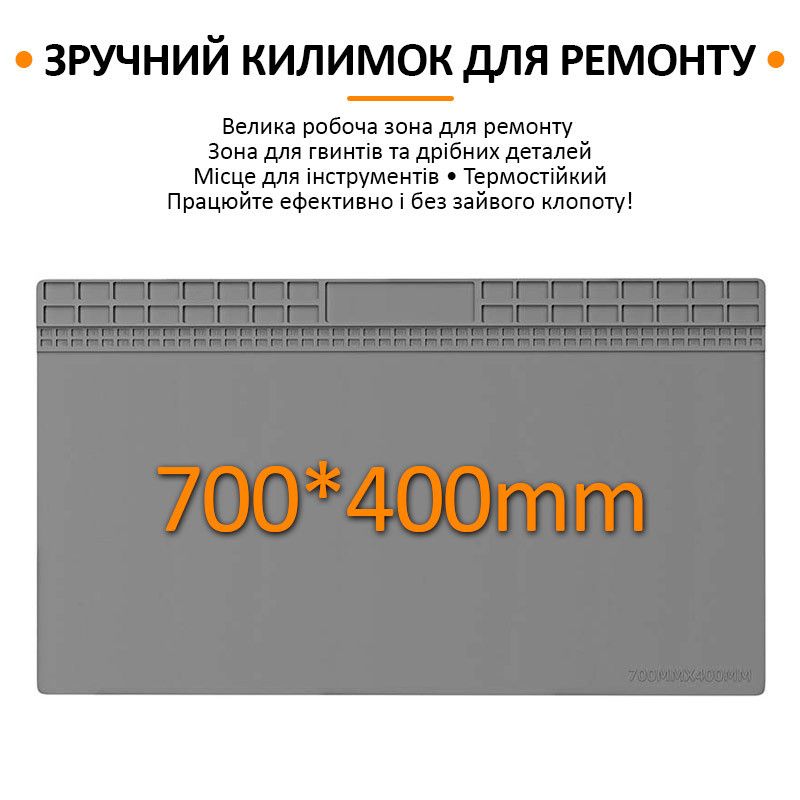 - Виготовлений із якісного термостійкого силікону, килимок здатний витримувати температуру до 500°C, не втрачаючи форму і не плавлячись. Це робить його ідеальним для паяння, демонтажу мікросхем та інших високотемпературних процесів.