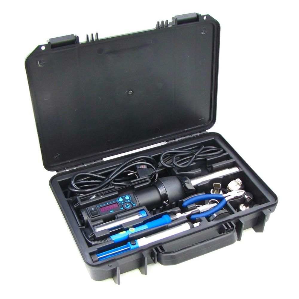Це компактна мобільна міні-станція для повноцінного ремонту електроніки: в одному удароміцному кейсі зібрані потужний термофен, паяльник з регулюванням температури та базовий набір інструментів та розхідників. Цей набір розрахований на монтаж та демонтаж SMD-компонентів, ремонт плат смартфонів, ноутбуків, блоків живлення та іншої побутової техніки як у сервісі, так і вдома.