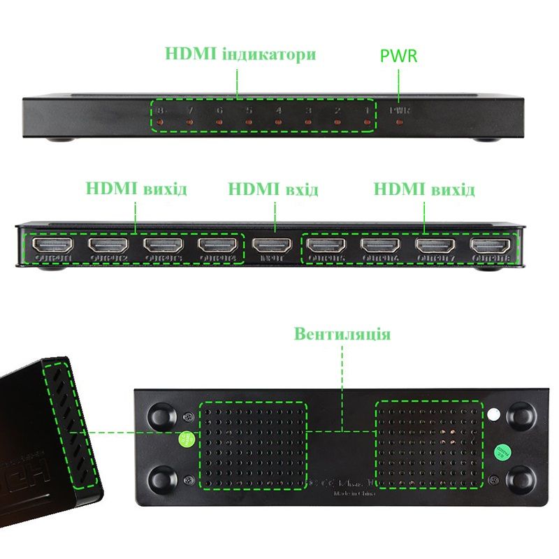 - Спліттер приймає сигнал від одного HDMI-джерела і розподіляє його на вісім приймачів, що зручно для відеостін, презентацій, виведення реклами та інформації в торгових точках, ресепшенах і т.д.