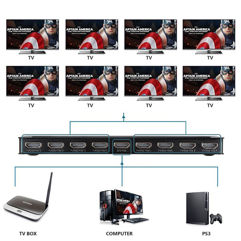 Цей спліттер призначений для розподілу сигналу від одного HDMI-джерела відразу на вісім дисплеїв. Пристрій дозволяє одночасно підключити кілька телевізорів, моніторів або проекторів до одного ресивера, медіаплеєра, ТВ-приставки, комп'ютера або ігрової консолі. Підтримка стандарту HDMI 1.4b, роздільної здатності до 4K UHD та 3D-відео робить цей спліттер оптимальним вибором для комерційних відеостін, демонстраційних залів, магазинів, навчальних класів та домашнього кінотеатру.
