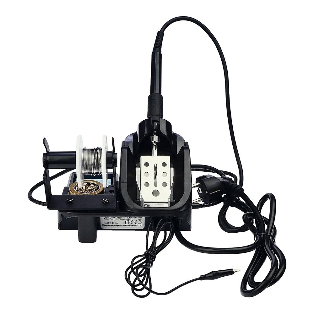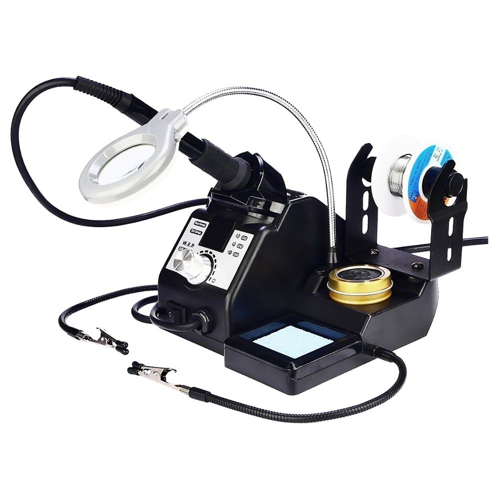 - Всі необхідні елементи (підставка, очищувачі жала, тримач припою, лупа) розташовані на одній базі і не займають зайвого місця на столі.