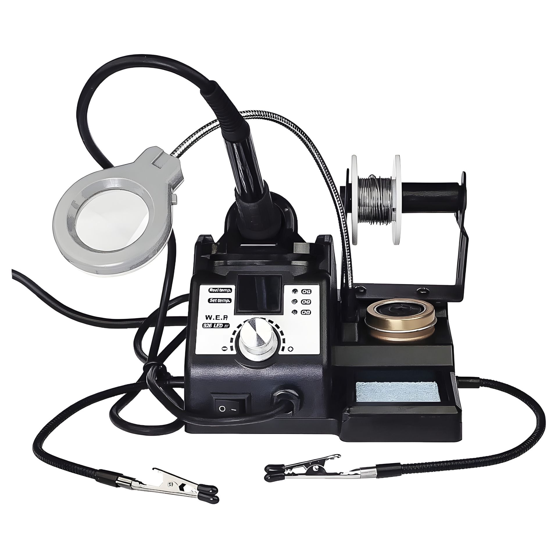 Паяльна станція WEP 926 LED-IV – це багатофункціональний комплекс для точного паяння, що поєднує в одному корпусі паяльник з цифровим керуванням, лупу з підсвічуванням, тримачі плат та котушки припою, а також повноцінне робоче місце з очищенням жала. Підходить для ремонту смартфонів, комп'ютерної техніки, аудіо- та відеопристроїв, виготовлення та обслуговування різних електронних схем вдома та в сервісному центрі.