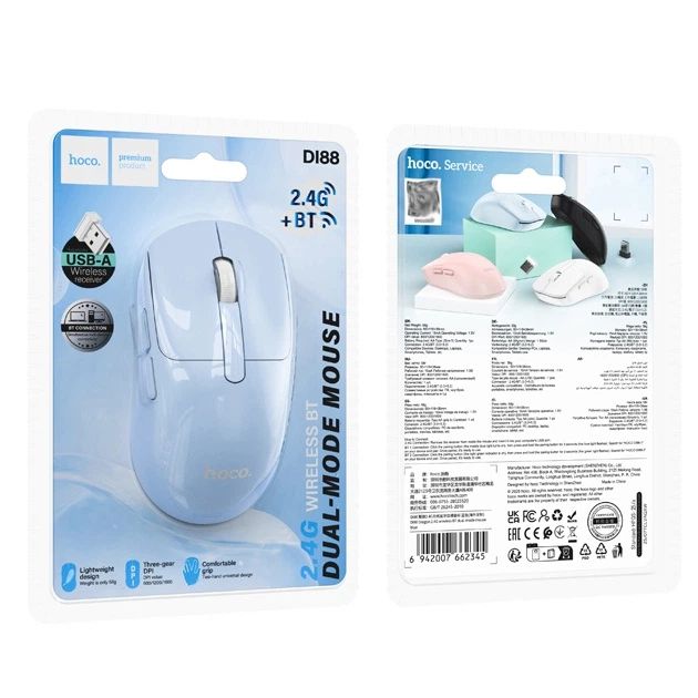Бездротова миша Hoco DI88 – це компактна та стильна миша з двома режимами підключення, створена для комфортної роботи за ноутбуком, ПК, планшетом чи смартфоном. Завдяки регулюванню чутливості та зручній формі вона однаково добре підходить для офісу, навчання та будинку.