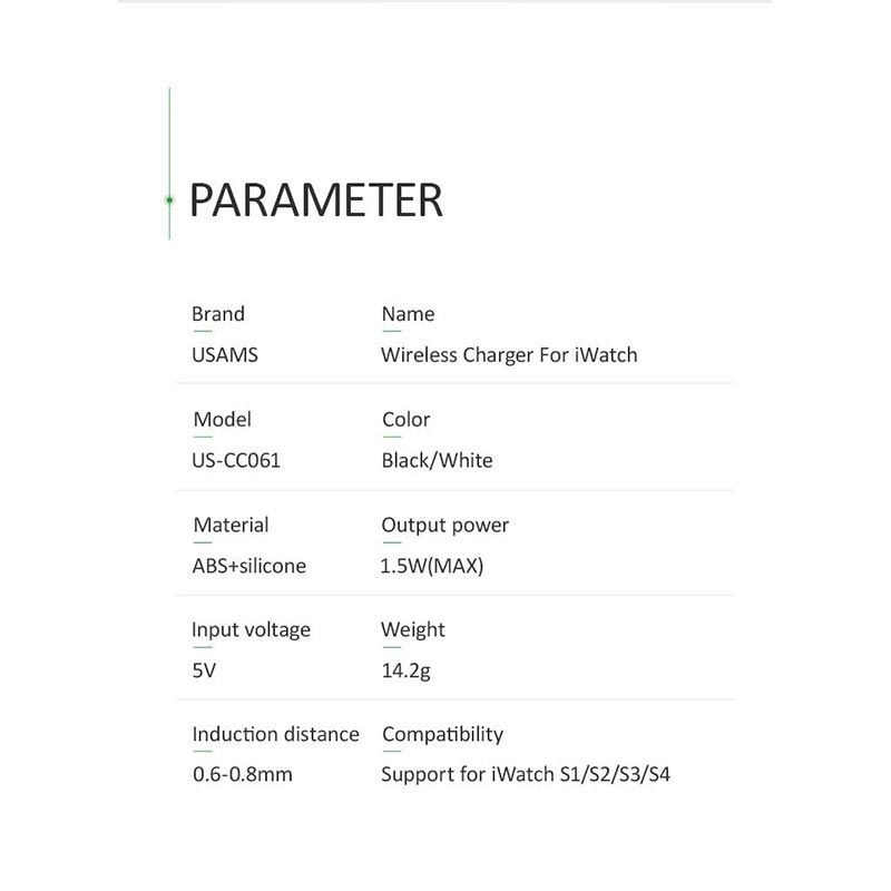 USAMS US-CC061 — це компактний бездротовий зарядний пристрій, призначений для зручного та безпечного заряджання смарт-годинників Apple Watch. Модель виконана в мінімалістичному дизайні, відрізняється малою вагою та високою портативністю, що робить її чудовим рішенням для дому, офісу та поїздок. Цей зарядний пристрій підтримує стандарт Qi та забезпечує стабільне живлення годинника при підключенні до ноутбука, ПК або мережевого адаптера.