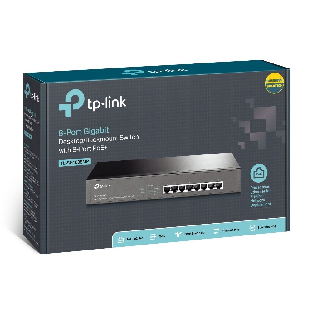 - TL-SG1008MP - це 8-портовий гігабітний комутатор з можливістю розміщення на столі або в стійці, всі 8 портів якого підтримують PoE+. Він дозволяє легко розширювати дротову мережу, передаючи живлення і дані по кабелю Ethernet. Завдяки максимальній споживній потужності PoE до 126 Вт і до 30 Вт на порт TL-SG1008MP може живити такі пристрої, як Wi-Fi точки доступу, IP-камери або IP-телефони. Завдяки режиму енергозбереження TL-SG1008MP може зберігати до 75% енергії, що робить його економічним та екологічним рішенням для корпоративної мережі.