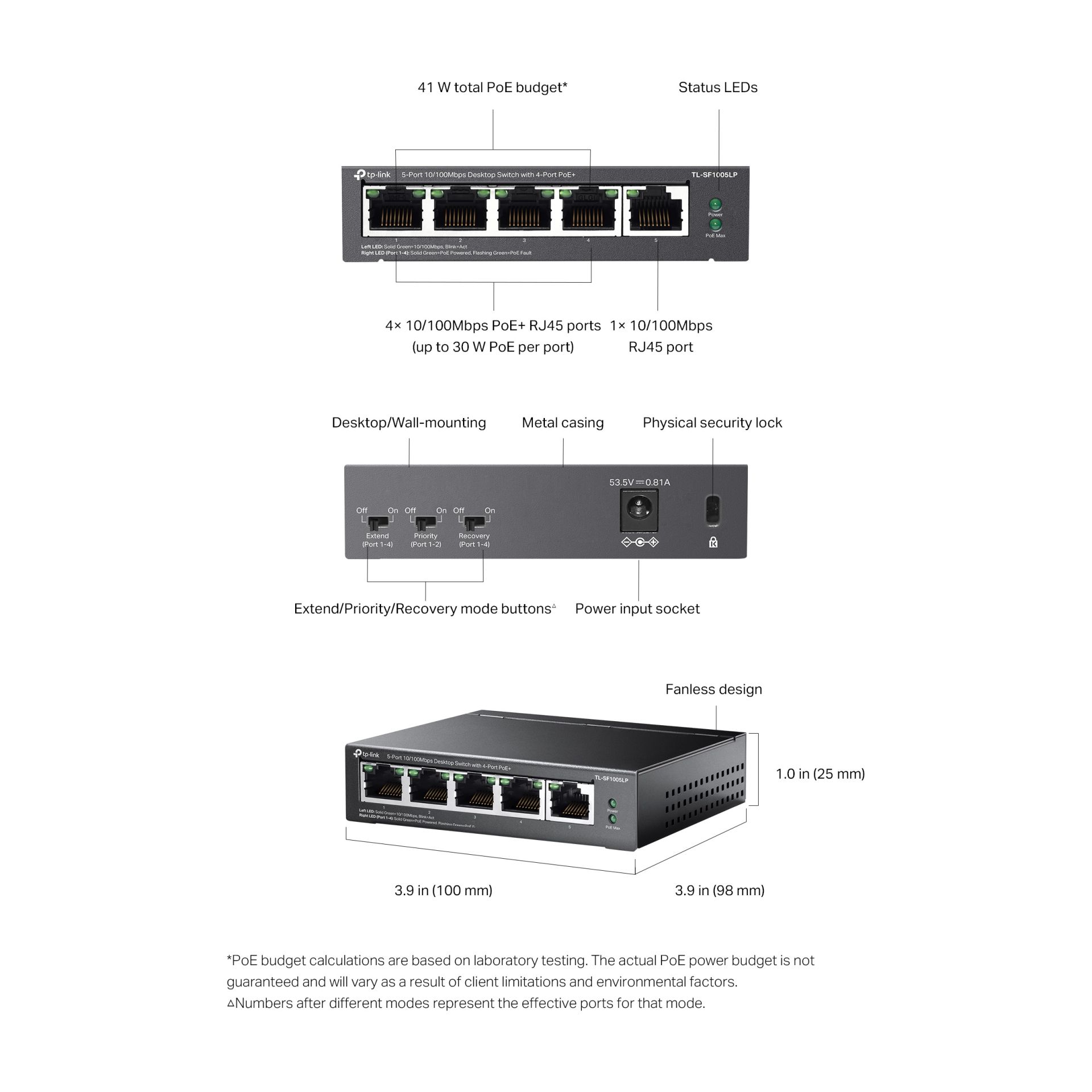 - 5 10/100 Мбіт/с RJ45 портів (порти 1–4 підтримують 802.3af/at PoE)