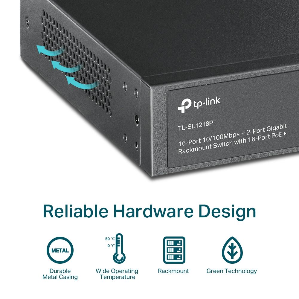 - TL-SL1218P оснащений 16 портами Fast Ethernet PoE+ (10/100 Мбіт/с), 2 гігабітними RJ45-портами та 1 комбінованим гігабітним SFP-слотом. Таке поєднання забезпечує стабільну магістральну передачу даних та гнучкість при побудові мереж відеоспостереження та офісної інфраструктури.