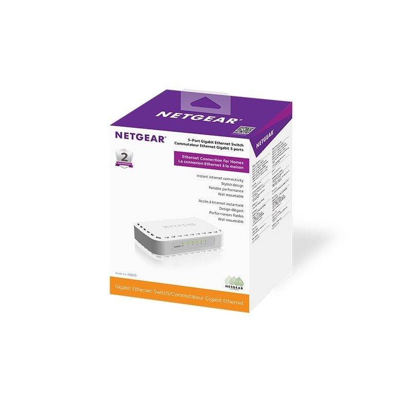 NETGEAR GS605 — це компактний некерований 5-портовий гігабітний комутатор, призначений для швидкого і простого розширення дротової мережі вдома або в малому офісі. Пристрій забезпечує стабільне з'єднання на швидкості до 1 Гбіт/с на кожному порту, працює за принципом Plug-and-Play і не потребує налаштування.
