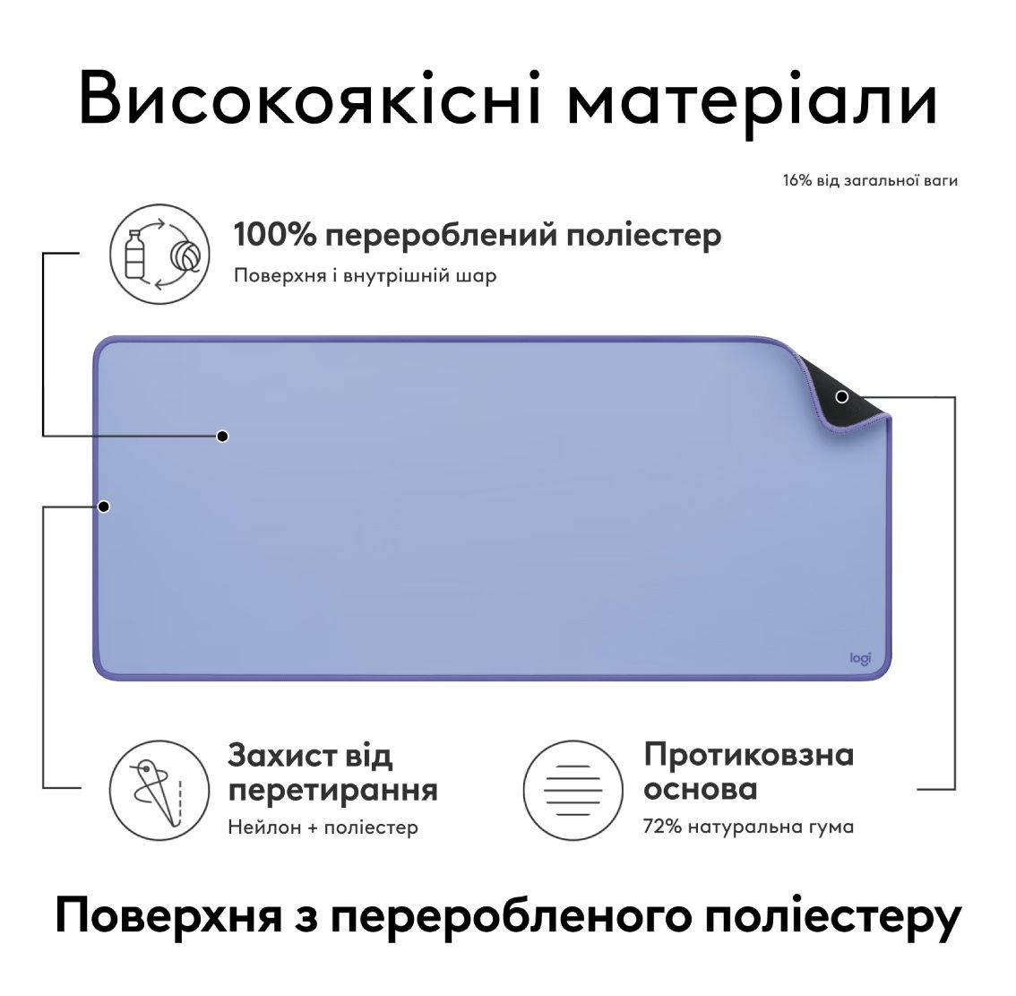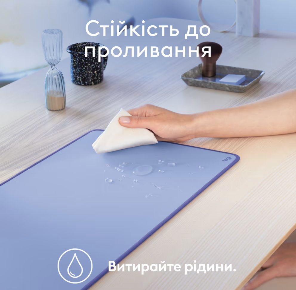 - Поверхня Logitech Desk Mat стійка до потрапляння вологи. Випадково пролитий напій не вбирається в матеріал — досить просто протерти килимок вологою серветкою, зберігши його зовнішній вигляд та чистоту.