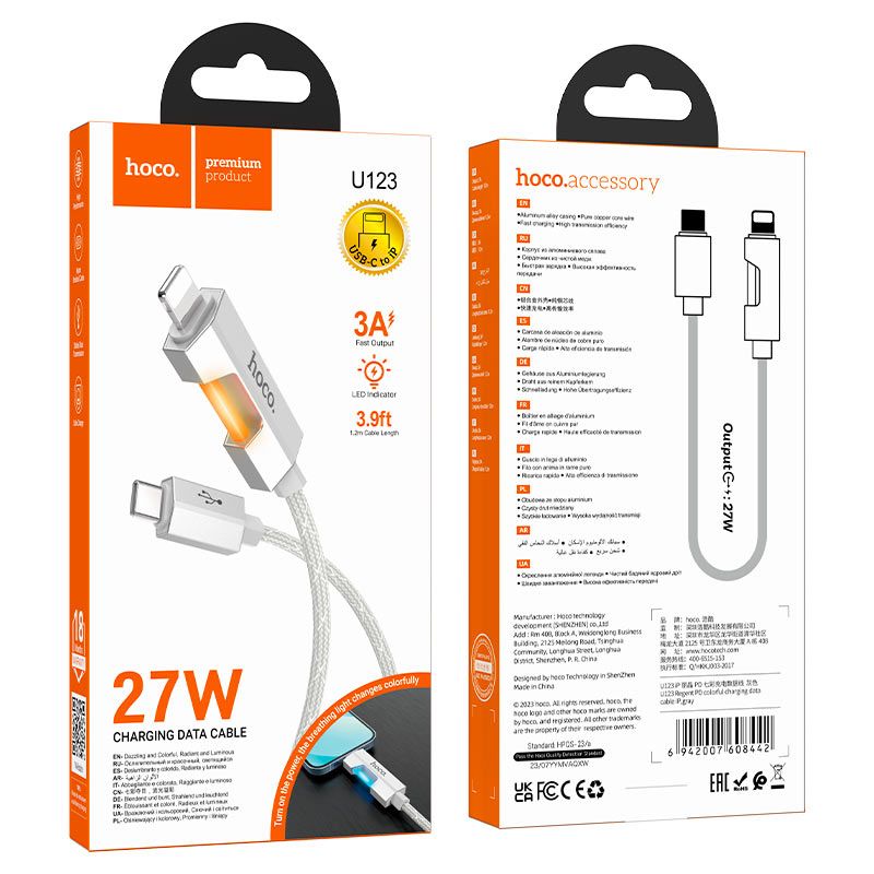Кабель Hoco U123 Type-C to Lightning – це високоякісний аксесуар для заряджання та передачі даних пристроїв Apple. Ця модель підтримує швидке заряджання Power Delivery з потужністю до 27W, забезпечуючи ефективне живлення iPhone, iPad та інших сумісних гаджетів. Міцна нейлонова оплетка, надійні алюмінієві з'єднання та функціональні особливості роблять кабель довговічним та зручним для повсякденного використання.
