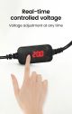 - Кнопка на корпусі кабелю дозволяє швидко змінювати вихідну напругу та адаптувати живлення під різні пристрої, а цифровий індикатор показує поточні параметри.