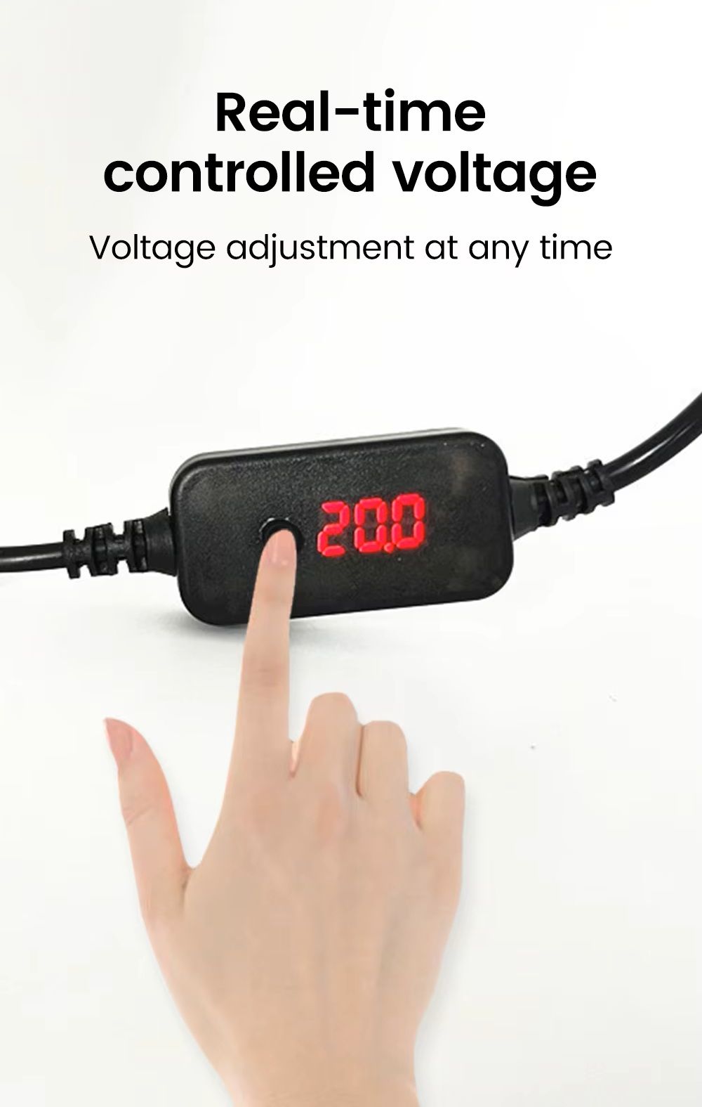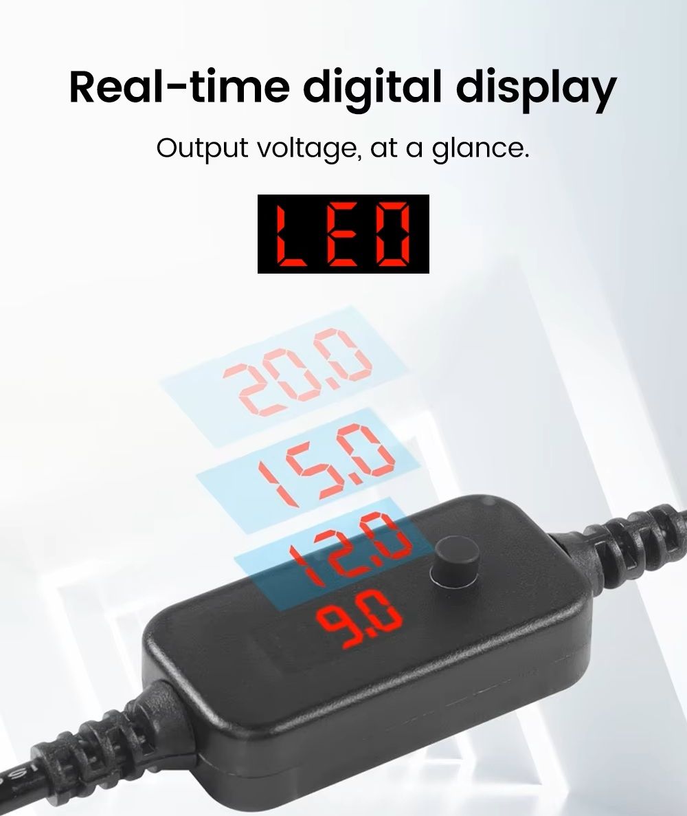 - Кнопка на корпусі кабелю дозволяє швидко змінювати вихідну напругу та адаптувати живлення під різні пристрої, а цифровий індикатор показує поточні параметри.