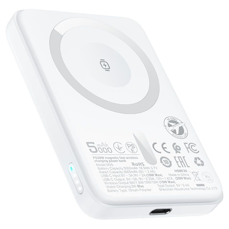 Завдяки ємності 5000 мА · год цей повербанк підходить для підзарядки мобільних пристроїв протягом дня. Вбудована магнітна система забезпечує точне позиціонування смартфона для ефективного бездротового заряджання. Порт Type-C підтримує двосторонню швидку зарядку, дозволяючи як швидко заряджати підключені пристрої, так і оперативно поповнювати заряд акумулятора.