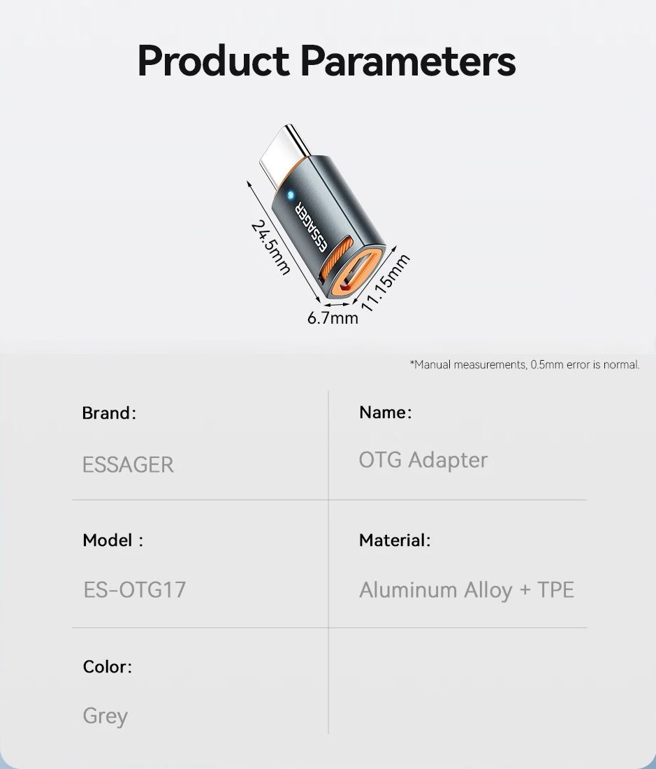 Компактний перехідник Essager Type-C → MicroUSB призначений для зручного підключення пристроїв із роз'ємом MicroUSB до сучасних гаджетів з інтерфейсом Type-C. Аксесуар забезпечує стабільну передачу даних та підтримку заряджання, а завдяки функції OTG дозволяє розширити можливості смартфонів, планшетів та ноутбуків. Мініатюрний розмір, міцні матеріали та надійна робота роблять його чудовим рішенням для повсякденного використання та подорожей.