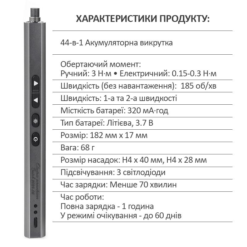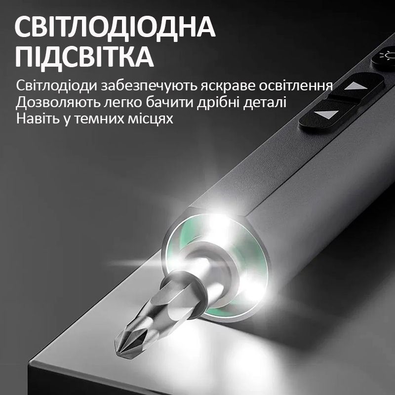 - Ця викрутка комплектується універсальним набором біт, що покриває практично всі завдання: