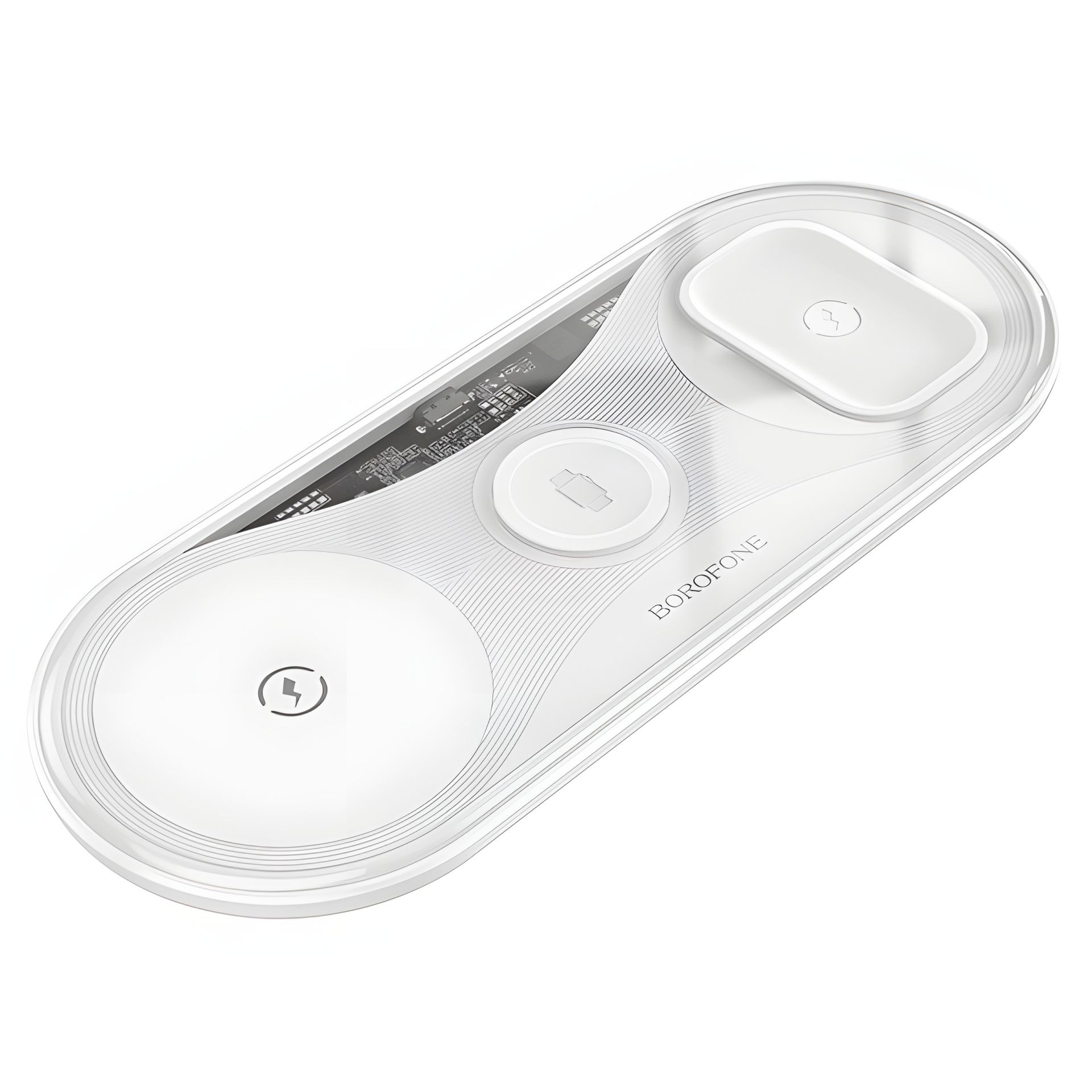 Borofone BQ19 — це універсальний бездротовий зарядний пристрій, розроблений для одночасного заряджання смартфона, бездротової гарнітури та смарт-годинника. Він поєднує в собі високу потужність, сучасний дизайн та зручність використання, позбавляючи необхідності використовувати кілька дротів і зарядних блоків.