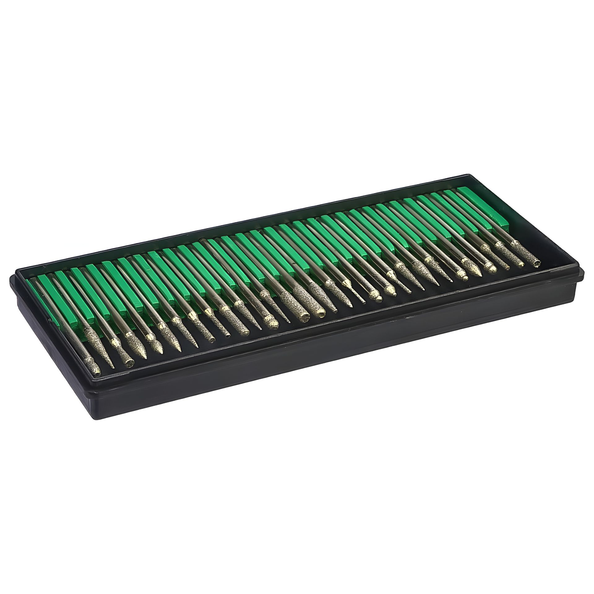 Універсальний набір фрез з алмазним напиленням призначений для обробки різних матеріалів – дерева, металу, скла, пластику, кераміки та каменю. У комплекті 30 насадок різних форм та розмірів, що дозволяє виконувати широкий спектр завдань: свердління, фрезерування, шліфування, гравірування та полірування.