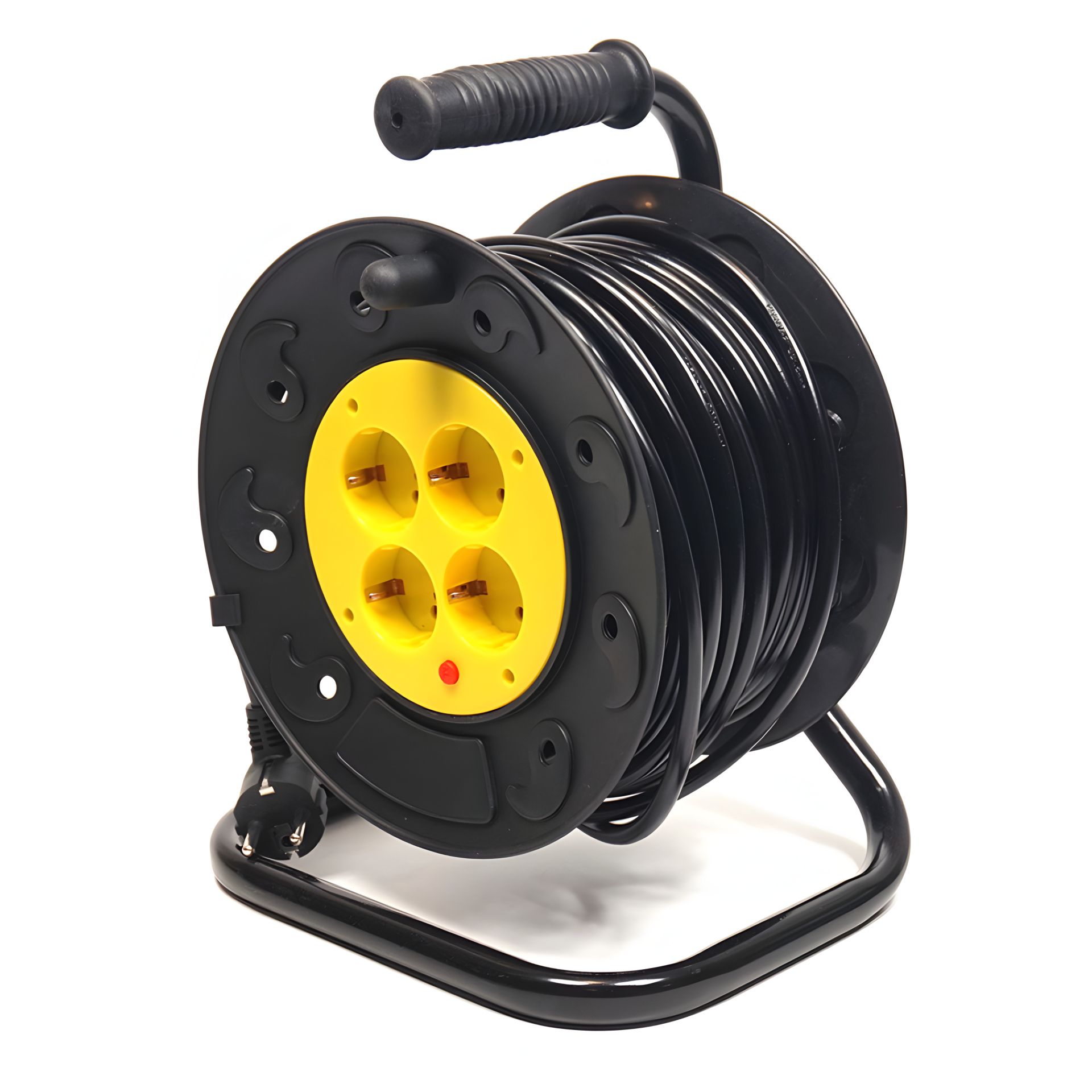 Подовжувач на котушці PowerPlant, морозостійкий, 25 м, 3x2.5мм2, 16А, 4 розетки (JY-2002/25), Чорно-жовтий